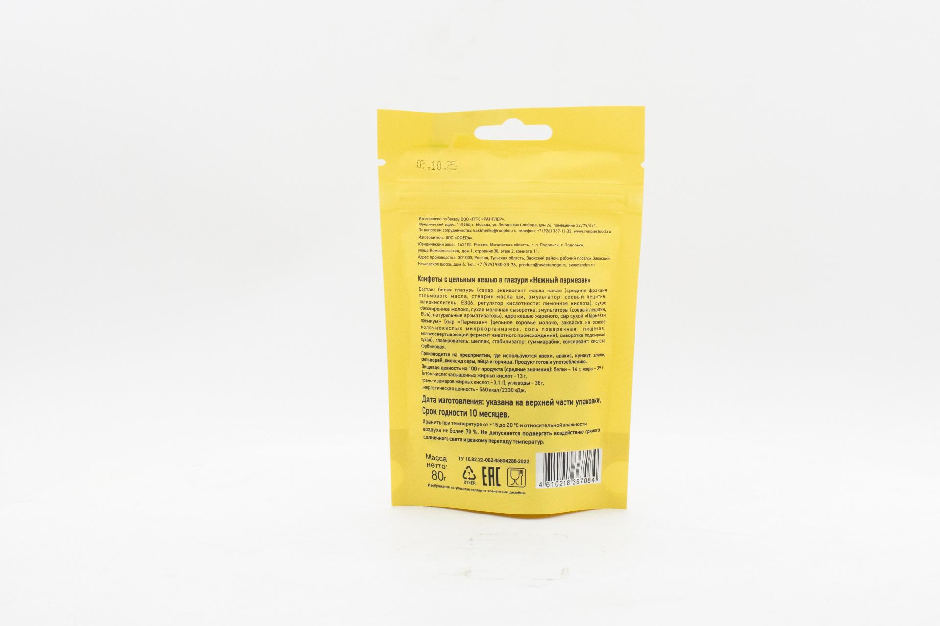 Конфеты Sweet&Go с цельным кешью в глазури «Нежный пармезан» (Россия) 80г121,28 руб. за штуку (в упак. 15 шт.) |