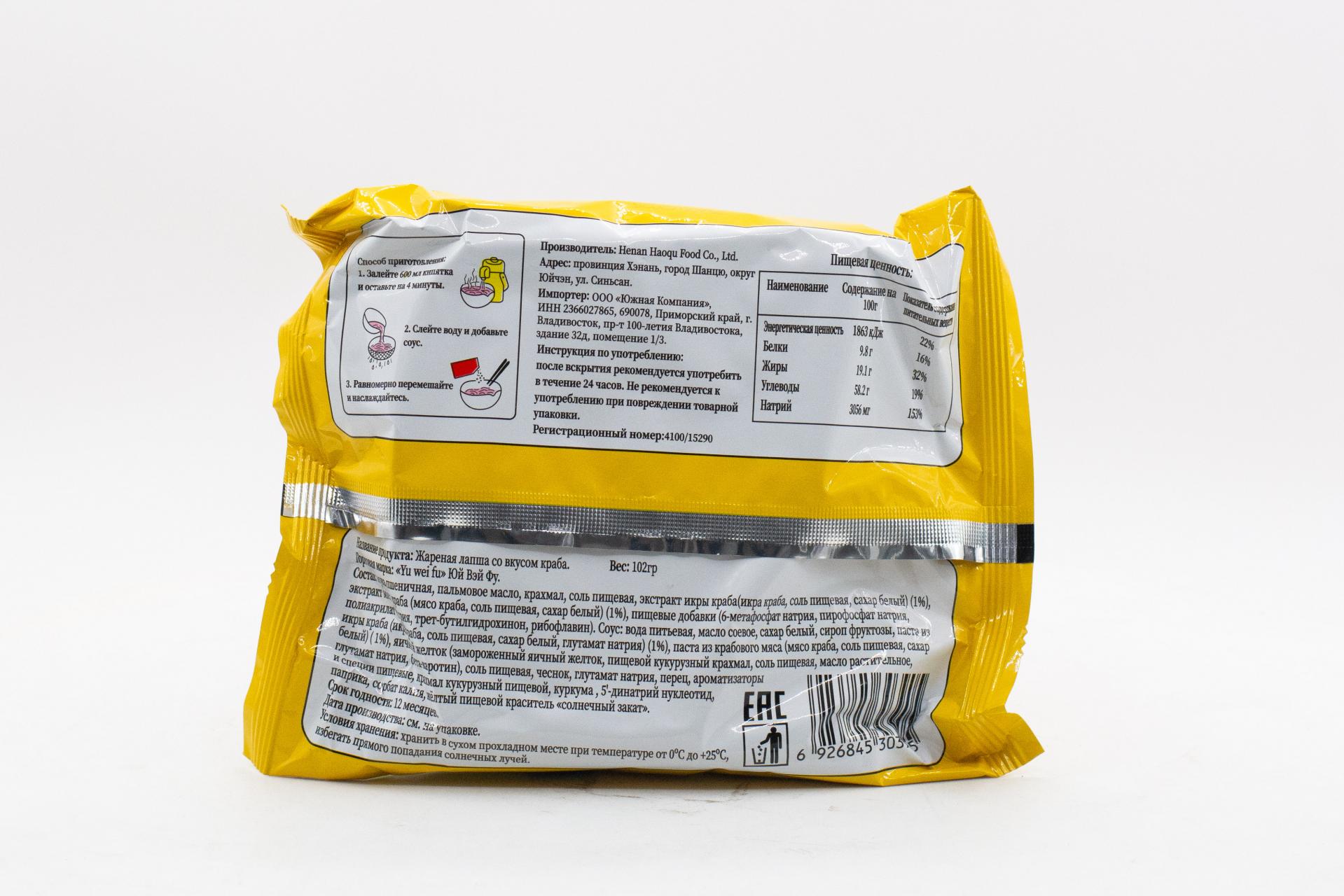 Лапша жареная Юй Вэй Фу со вкусом краб (Китай) 102г47,50 руб. за штуку (в упак. 5 шт.) |