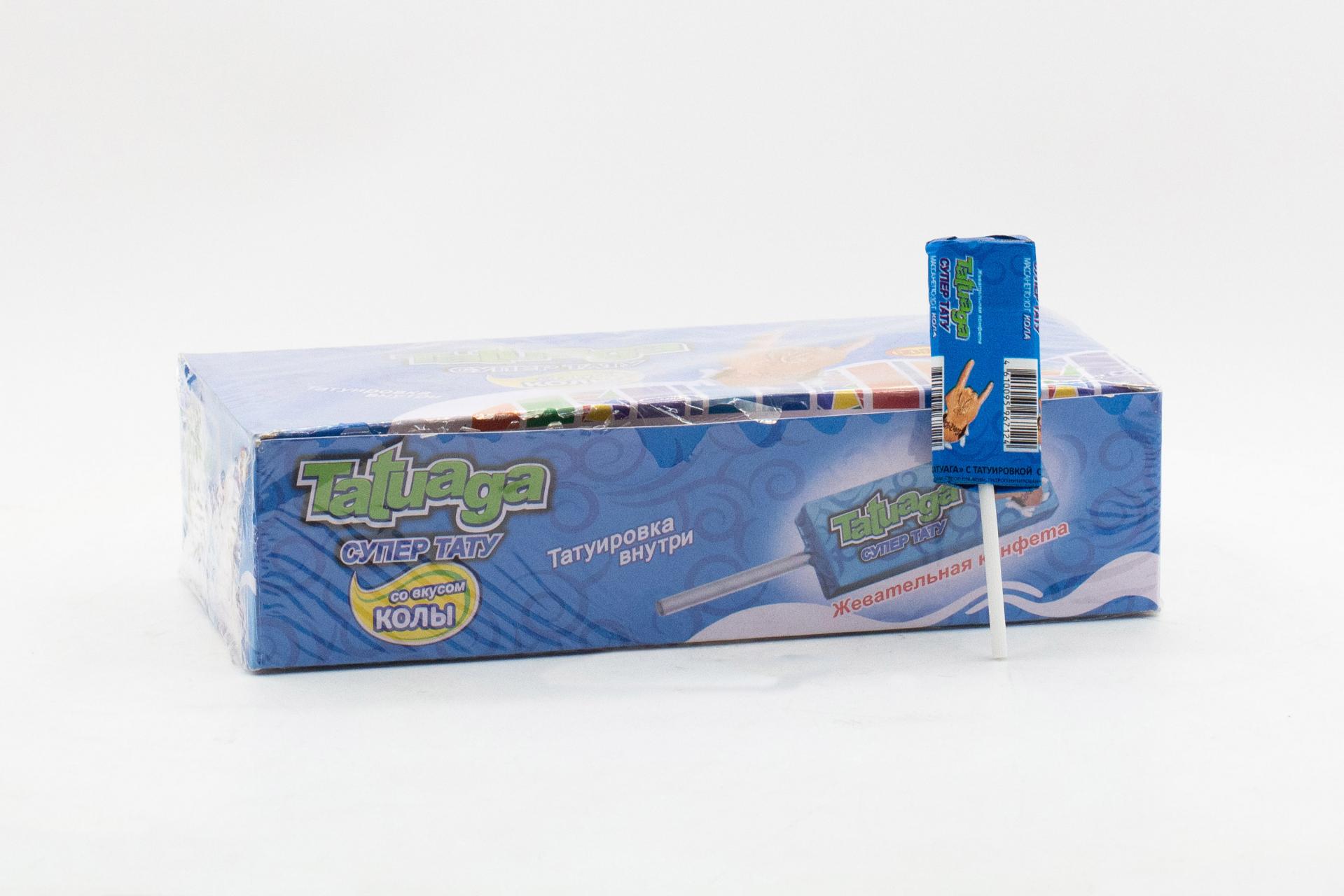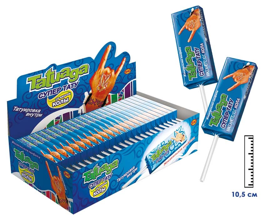 Жевательная конфета на палочке Tatuaga с тату Кола (Пакистан) 10г5,30 руб. за штуку (в упак. 50 шт.) |